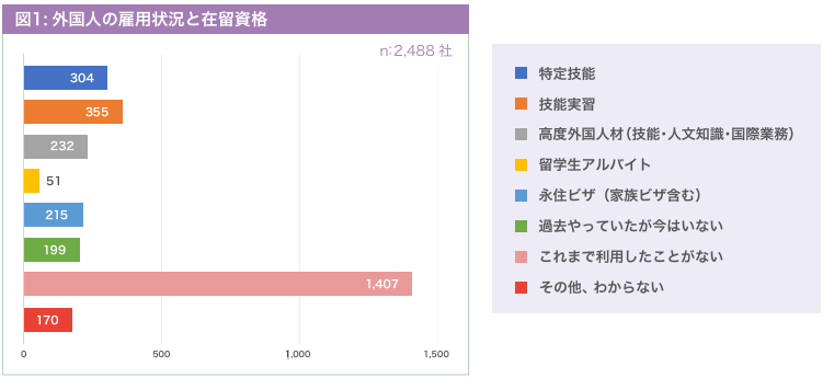 調査結果から、外国人労働者の導入は依然として限定的で、回答企業の約57%は外国人を雇用したことがないことがわかった。特に小規模企業でその傾向が強い一方、製造業や建設業では技能実習や特定技能を活用した雇用が進んでいることが明らかになった。また、企業規模が大きいほど外国人雇用の実施率が高く、活用される在留資格も多様化する傾向がみられた。