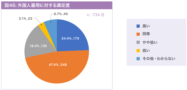 外国人雇用に対する満足度は「日本人と同等」が約47%、「高い」が約24%であり、一定の評価がある一方、「言語の壁」や「生活面の支援負担」といった課題も顕著である。