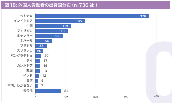 外国人労働者の多くはベトナム、インドネシア、中国出身で、少人数受け入れが主流である。特定技能・技能実習にかかる紹介料や監理費用は企業によって幅があり、中小企業にとって教育・管理コストは導入のハードルとなっている。