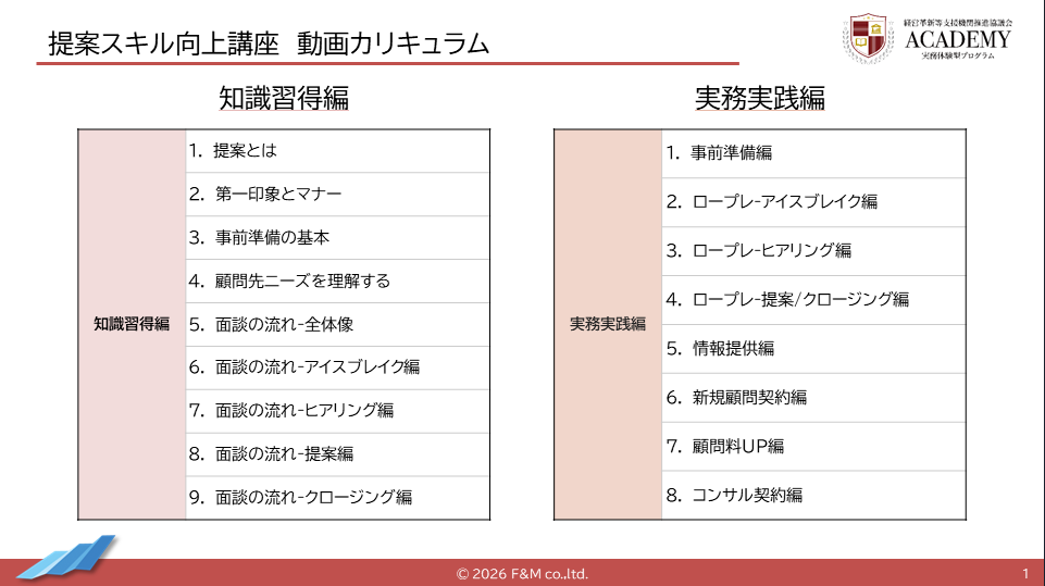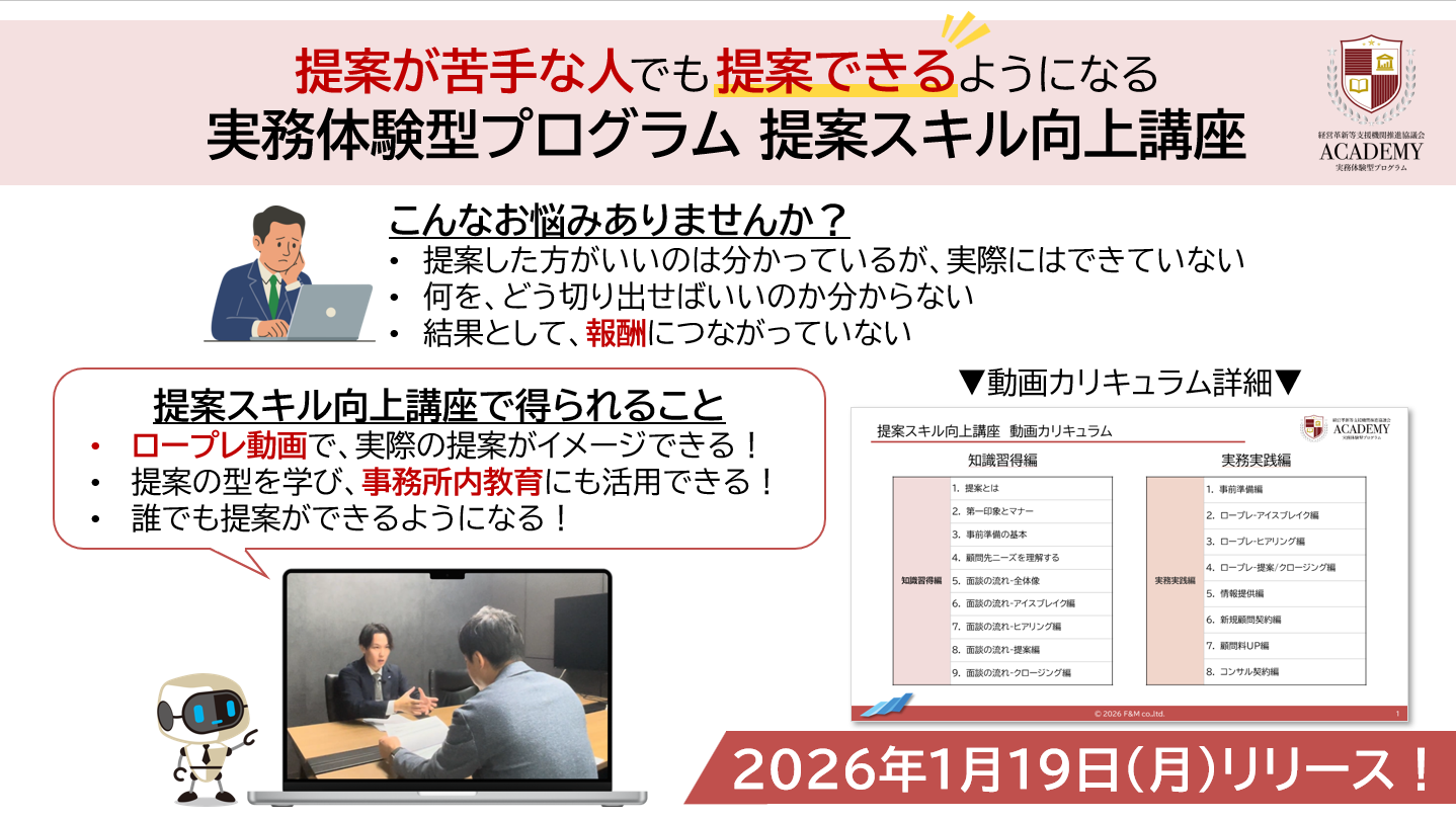 株式会社エフアンドエム(本社:大阪府吹田市、代表取締役社長:森中 一郎)が運営する「経営革新等支援機関推進協議会」(以下、推進協議会)は、会計事務所職員の顧問先への提案スキルを実践的に育成する新サービス「実務体験型プログラム~提案スキル向上講座~」の提供を開始します。