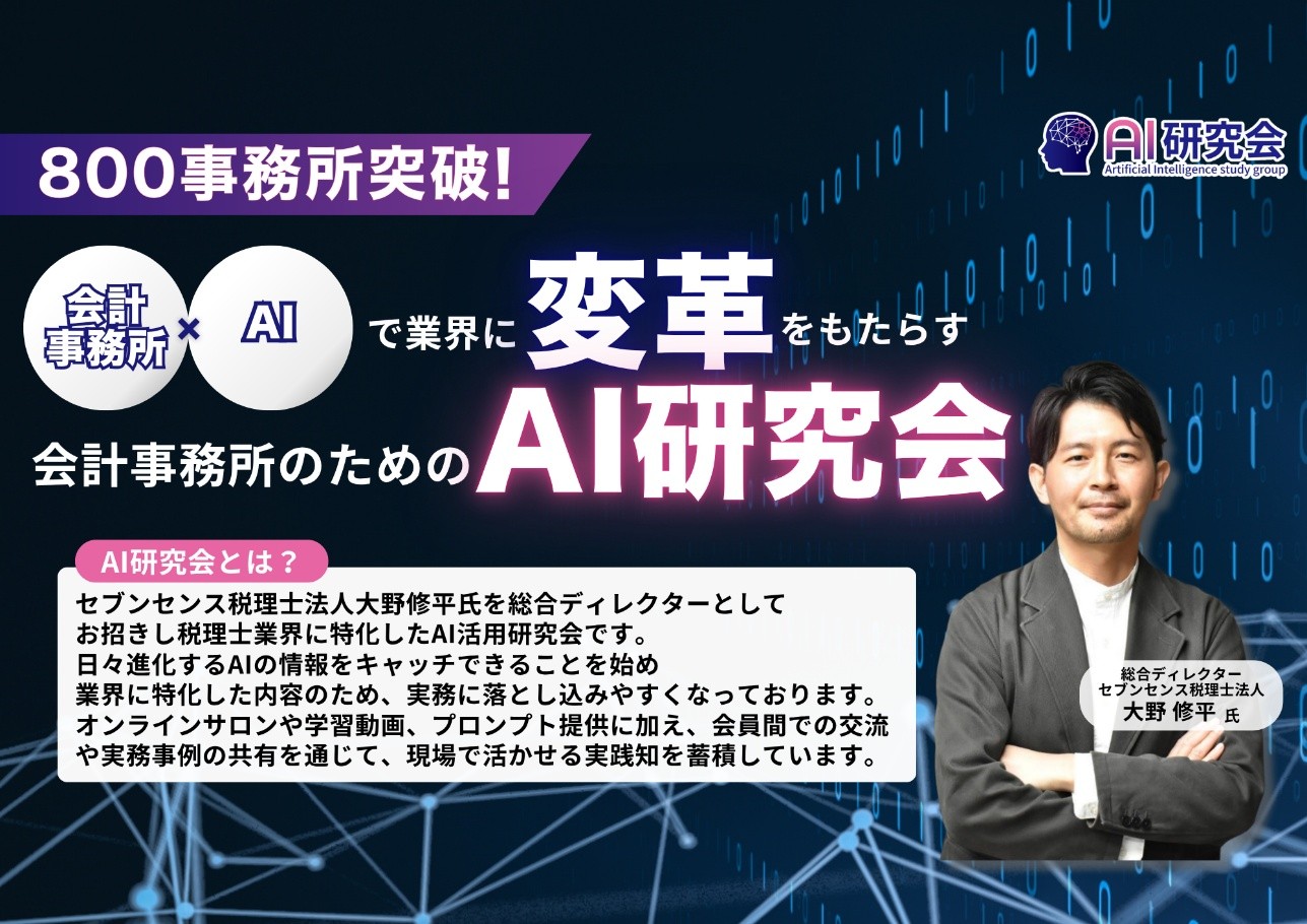 セブンセンス税理士法人の大野修平氏を総合ディレクターに迎え、会計業界に特化したAI活用を支援する研究会です。日々進化するAI情報のキャッチアップ、オンラインサロンや学習動画、実務で使えるプロンプト提供、会員間での交流や実務事例の共有を通じて、現場で活かせる実践知を蓄積しています。