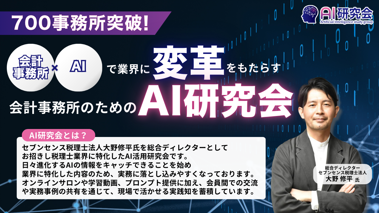 セブンセンス税理士法人大野修平氏を総合ディレクターに迎え、会計業界に特化したAI活用を支援する研究会です。日々進化するAI情報のキャッチアップ、オンラインサロンや学習動画、実務で使えるプロンプト提供、会員間での交流や実務事例の共有を通じて、現場で活かせる実践知を蓄積しています。